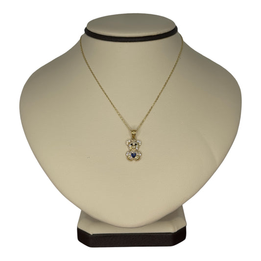 10KT Gold Blue Heart CZ Teddy Bear Necklace