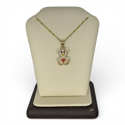 10KT Gold Red Heart CZ Teddy Bear Necklace