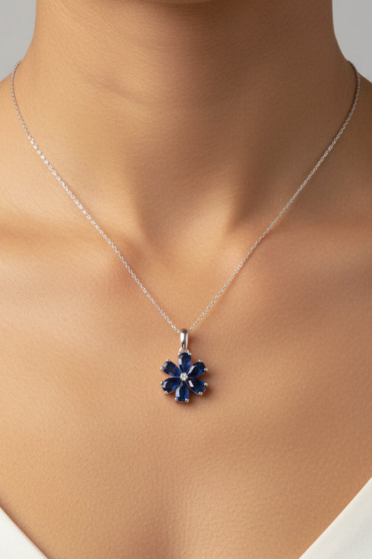 14k White Gold Sapphire Flower Birthstone Necklace DIAMOND 0.10CTW