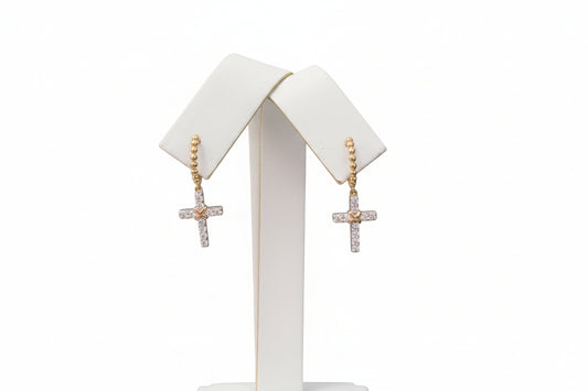 10k Yellow Gold LAB Round Beaded/ DIAMOND 0.56CTW Cross Dangly Hoops
