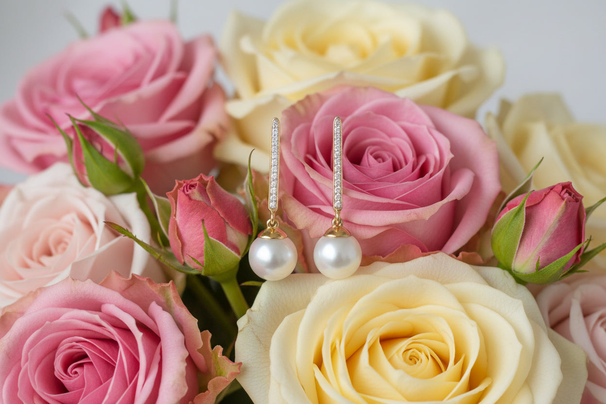 14k Yellow Gold Pearl Dangly DIAMOND 0.12CTW Birthstone Earings